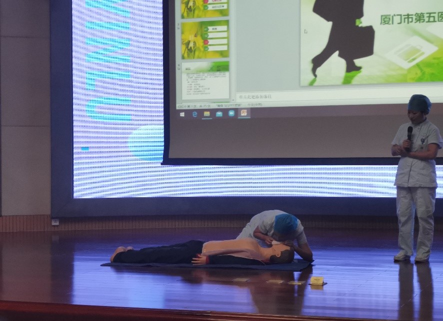 讲座现场,, 张护士长及其团队的优秀护士们携带了人体模型,,认真演示了人工呼吸、、、、心肺复苏急救法的动作规范,,通过情景互动方式,,让员工了解如何判断现场环境是否安全,,通过角色扮演加强印象,,,,让每个人有练习的机会。。。。