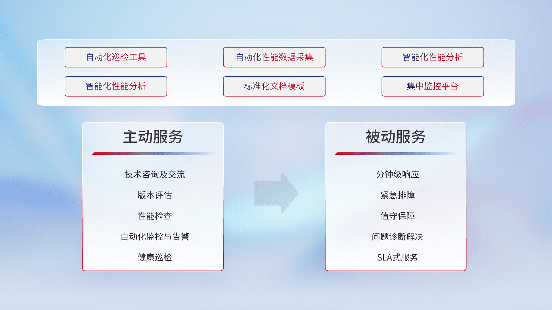智能化工具和标准化文档,,,保障服务质量,,,提供主动服务(包含技术咨询、、版本评估、、性能检查、、、、自动化监控与告警、、健康巡检)和被动服务包含(分钟级响应、、紧急排障、、、、值守保障、、、问题诊断解决、、SLA服务)。。。
