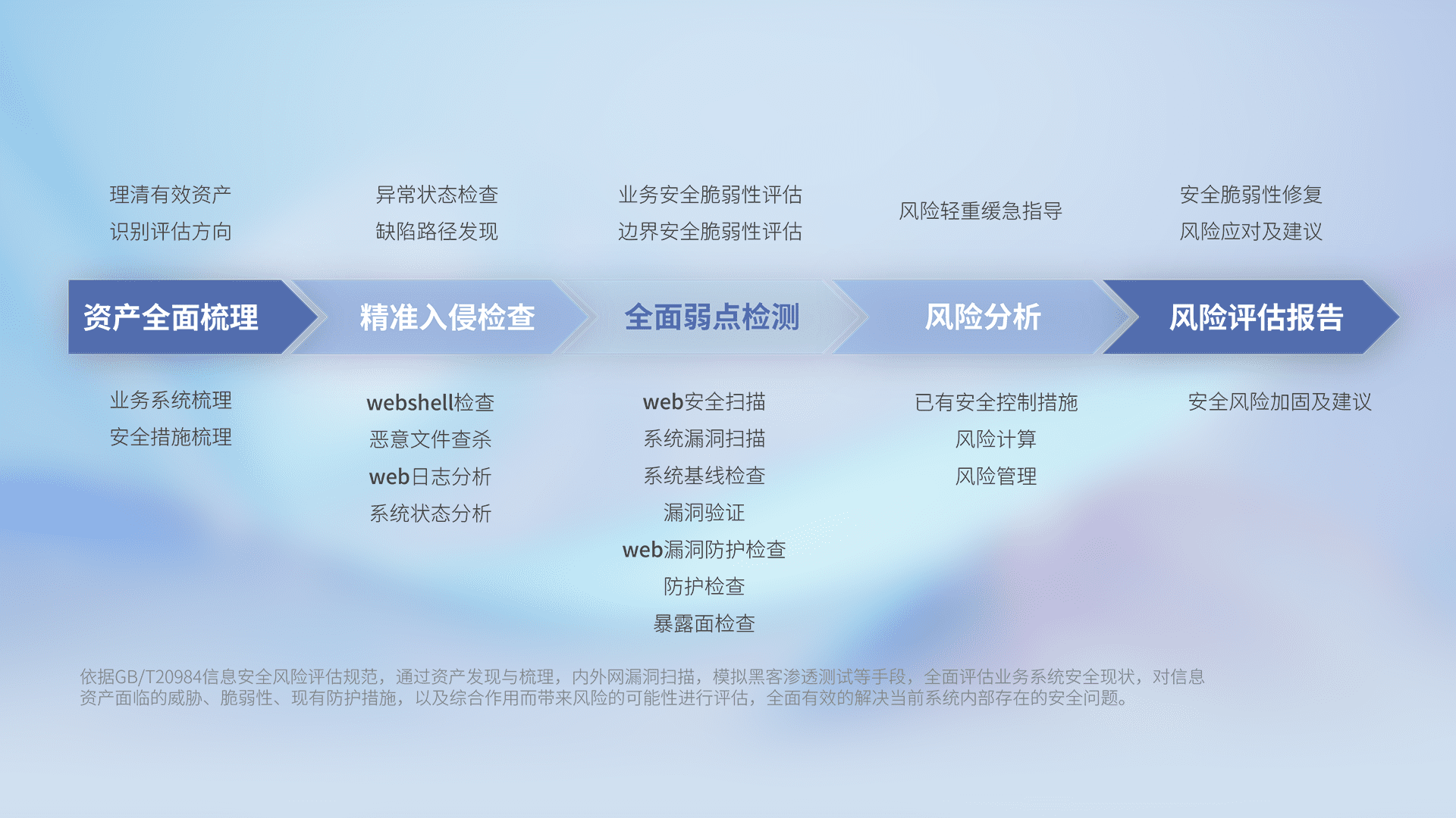 针对客户行业特性,,以专业的安全服务+多厂商联合解决方案提供专属的一站式安全管理服务,,,帮助客户全面感知网络空间威胁,,,,基于识别、、、检测、、、分析、、、防护、、、监测、、、、响应的服务理论模型,,,,从方案咨询、、、、集成交付、、、评估验证、、、、优化加固、、、运维运营,,,,致力于为客户提供完整的闭环管理式安全服务。。。。以实战经验为客户打造高抵御风险的安全体系,,,,帮助客户发现威胁、、对抗威胁、、处置威胁,,不断积累安全对抗能力,,,持续保障数字化安全。。。
